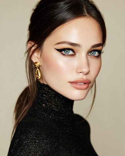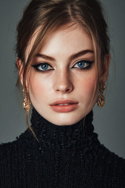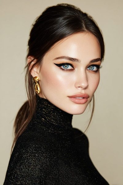 A sharp black winged liner paired with neutral lips is a classic combo.