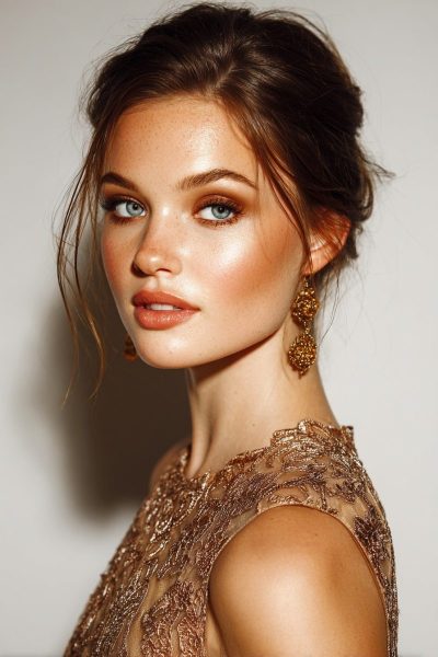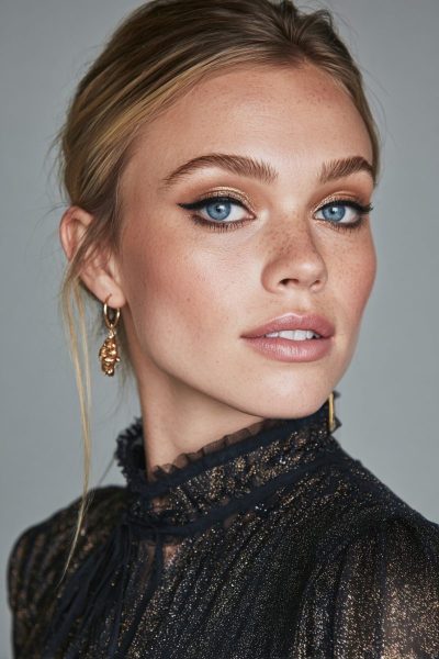 Complete the look with a soft neutral lip and a touch of highlighter on your cheekbones.