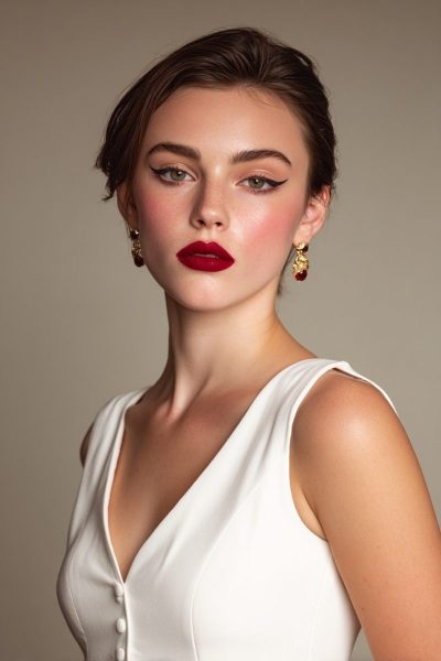 Begin by applying a classic red lip paired with a winged eyeliner for that old Hollywood vibe.