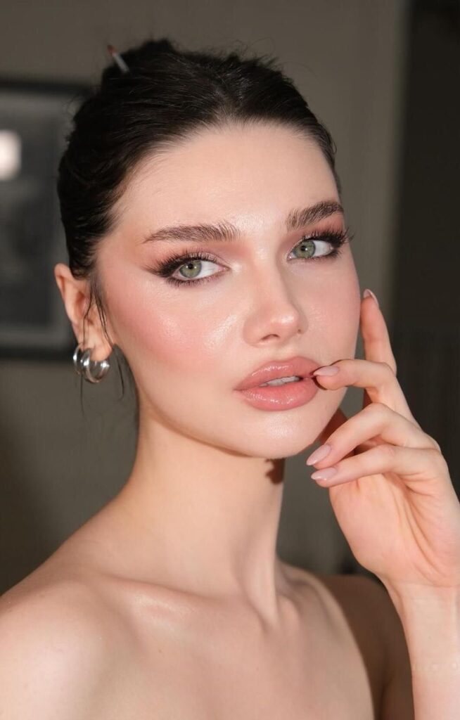 The skin is warm and luminous, cheeks carry a soft peach flush, and the lip stays nude so the eyes own the entire moment.