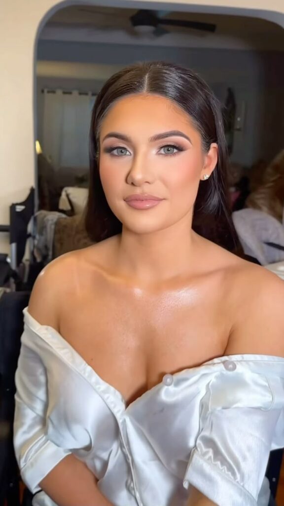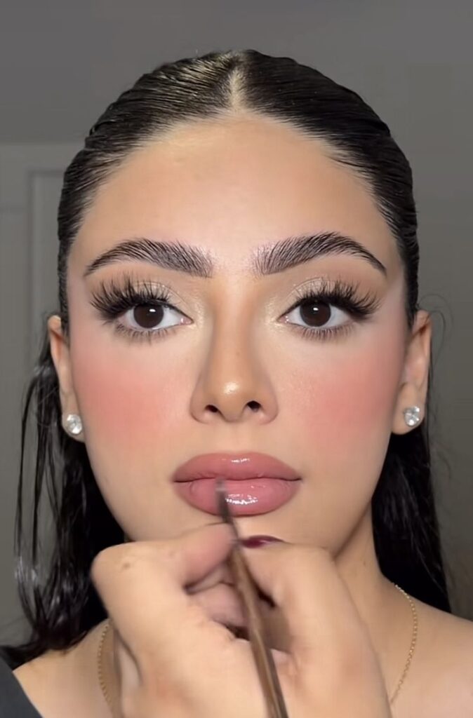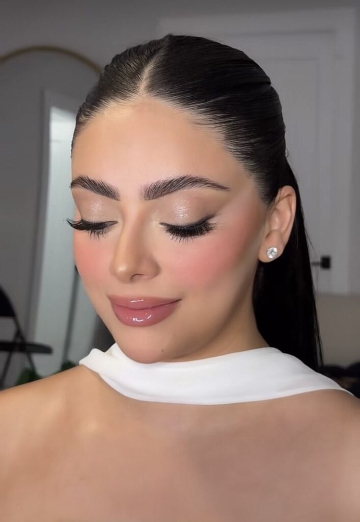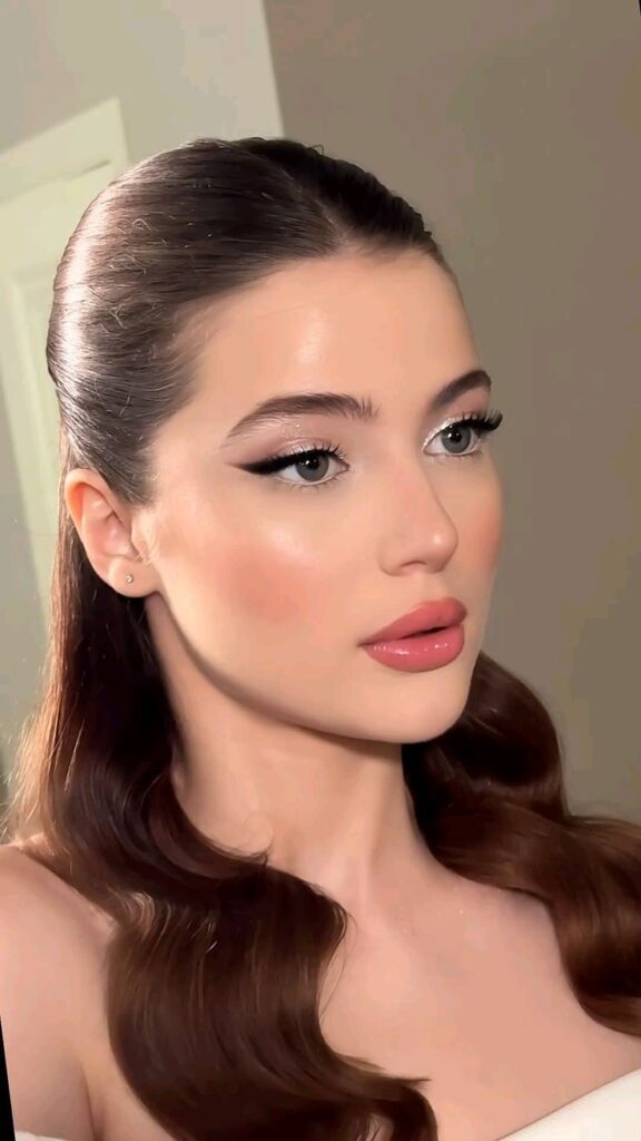 Rosy lips in a satin finish, skin that looks hydrated and real. This is genuinely the kind of look that photographs beautifully from every angle because nothing about it is harsh.
