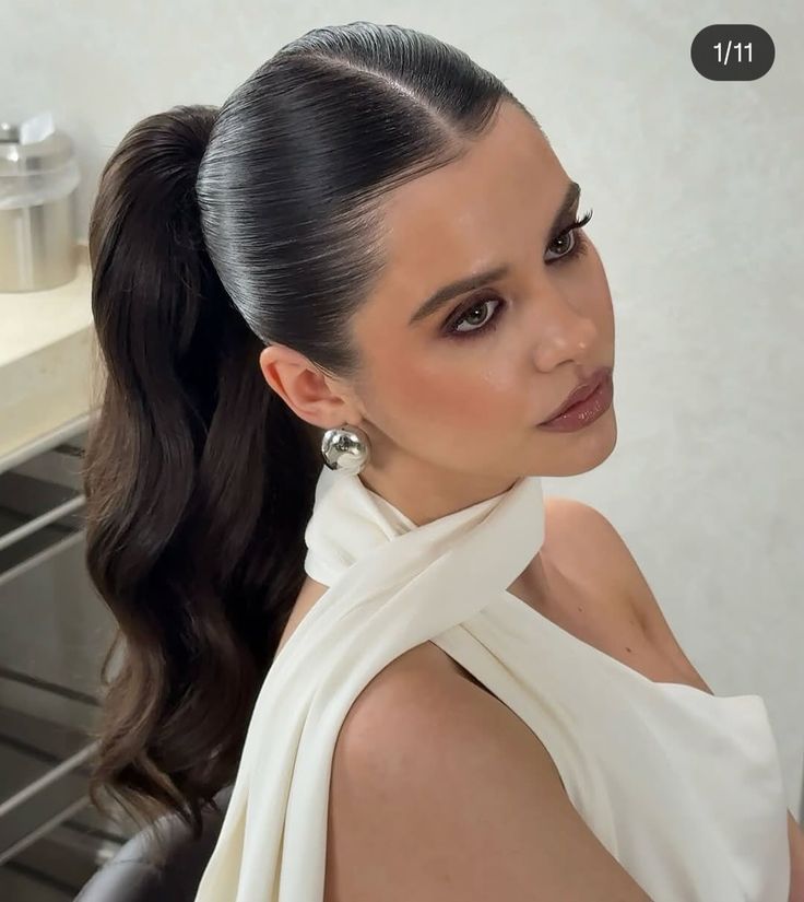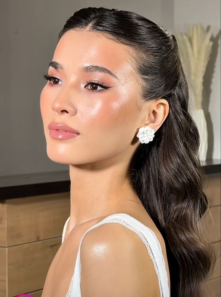 The sharp liner flick adds precision without fuss, and a peachy gloss lip keeps warmth in the face. So clean, so intentional, and it reads absolutely stunning against white.
