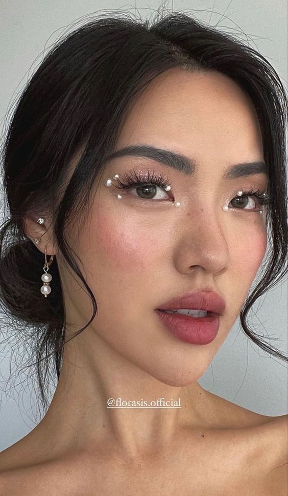 Micro pearl gems placed along the lower lash line and inner corners are the bridal detail nobody expected to want this much.
