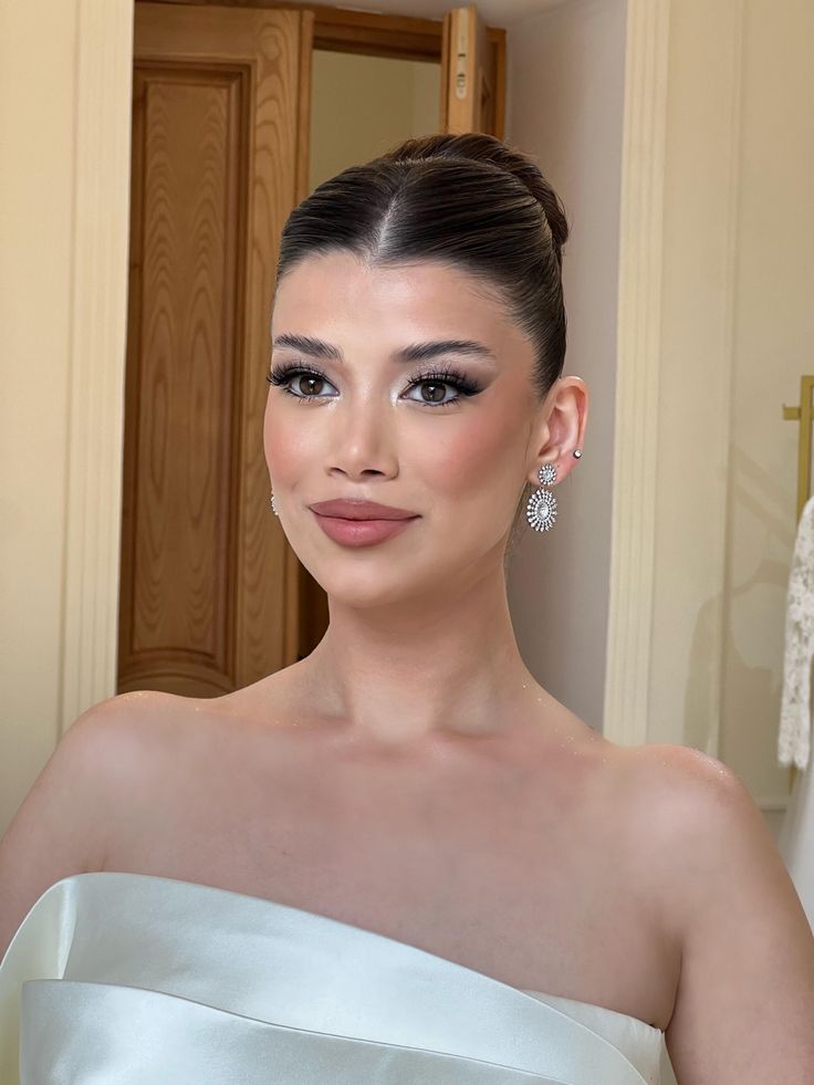 It sharpens the eyes dramatically while the overall look stays refined and bridal. The muted lip in a barely-there mauve keeps it from feeling too theatrical.